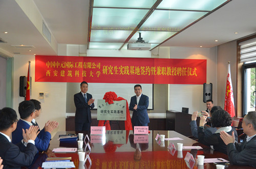 在两校的签约仪式上,刘小虎总经理和校领导签署了研究生校外实践教学基地协议书。校领导向公司授予了“研究生实践基地”铭牌,西建大校领导还为公司的四位兼职教授颁发了聘书。