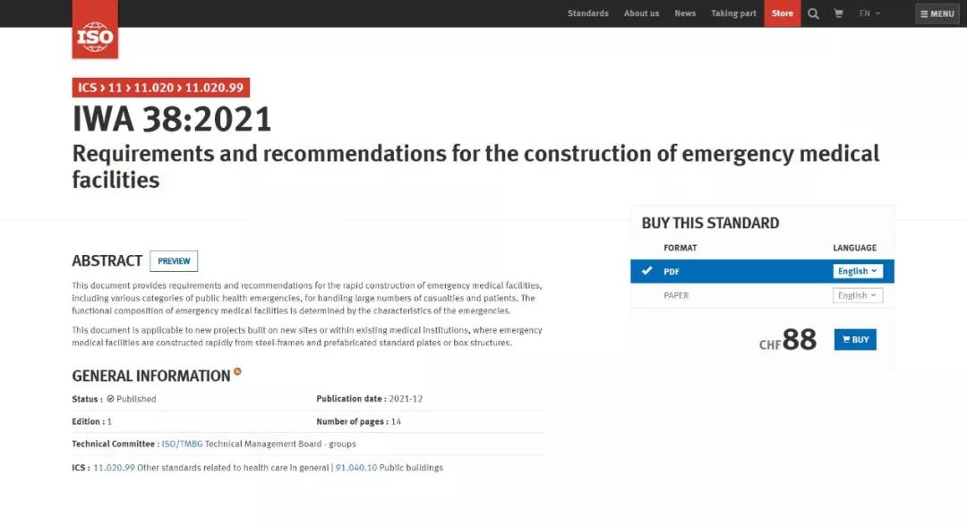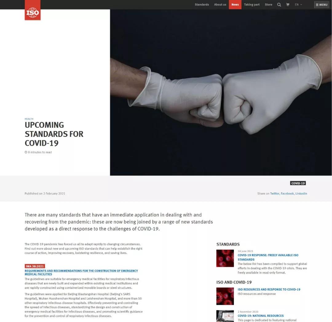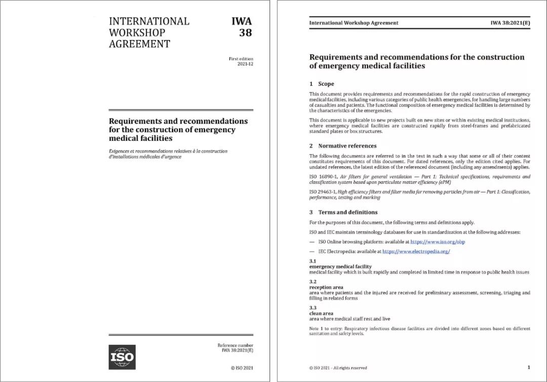 2021年12月20日,国际标准化组织(ISO)官方网站正式发布了HTH华体会体育登录入口hth.com牵头提出的国际研讨会协议IWA 38《应急医疗设施建设导则》(以下简称“《导则》”)。